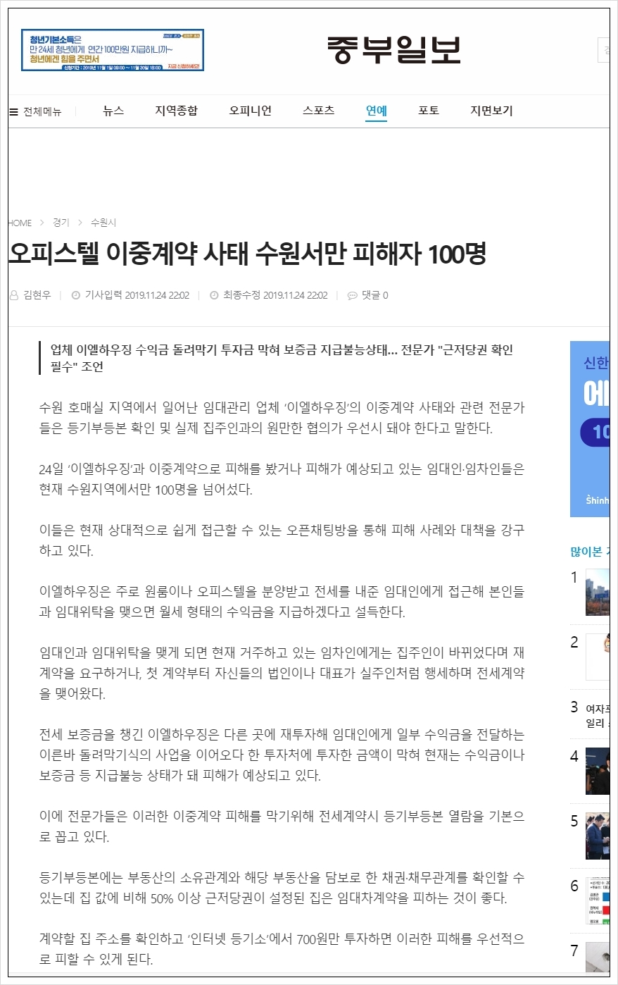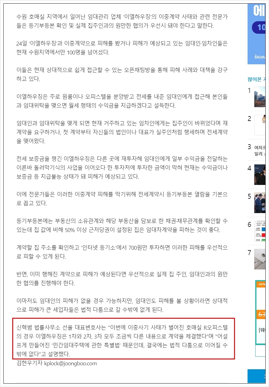 법률사무소 선율의 신혁범 대표 변호사는 최근 불거지고 있는 오피스텔 이중계약 사태에서 수많은 사람들을 대리하여 소송을 진행하고 있습니다. (주)이엘하우징 사건 이전에 (주)집이야기 사건에서 수원 최대의 임차인들을 대리하고 있으면 경기일보, 중부일보에서 인터뷰 요청이 들어와 인터뷰를 진행하기도 하였습니다.