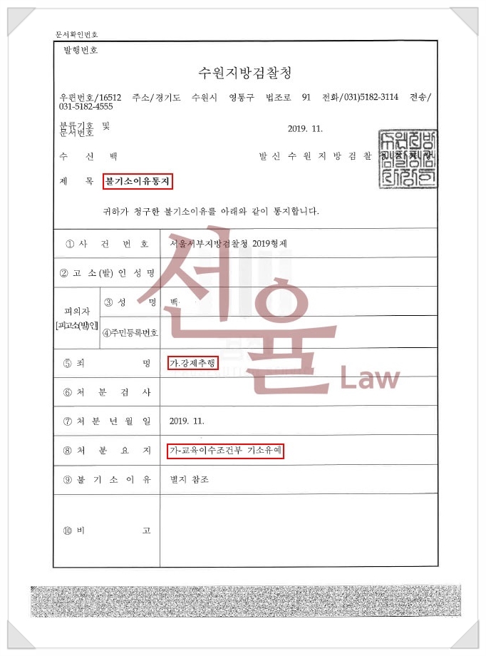 그 결과 검찰과 의견을 나누었고 검찰은 불기소처분(기소유예)를 내려주었습니다. 이로 인해 의뢰인은 어떤 전과도 생기지 않았고 어떤 보전처분도 받지 않았습니다.