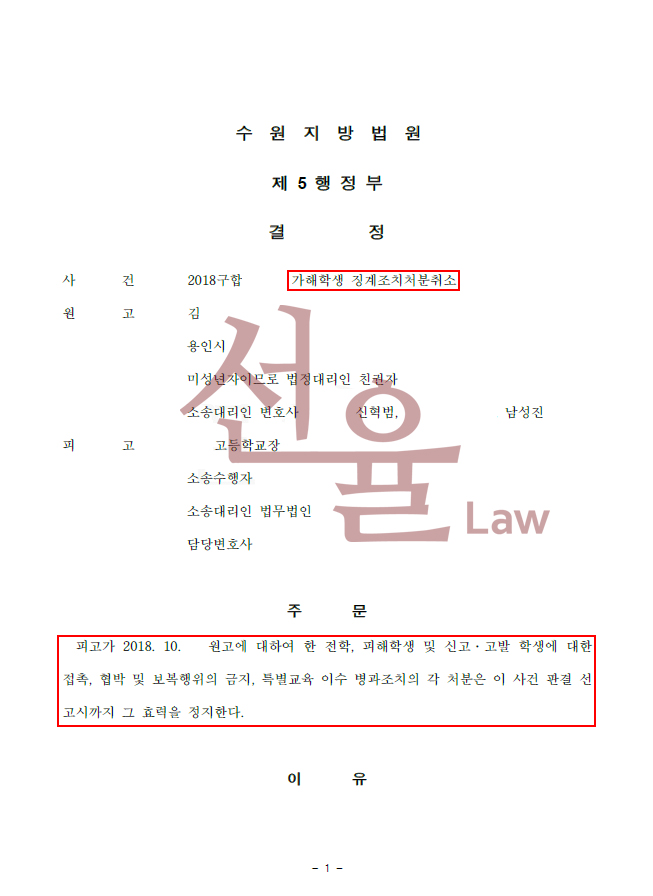 수원지방법원은 본 학교폭력변호사의 의견을 수용하여 집행정지 결정을 내렸습니다.