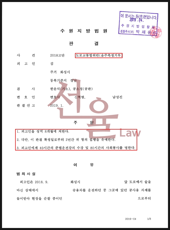 | 811 | 집행유예 | 화성음주운전재범변호사 | 음주 2회차, 0.119% 수치로 약 38km 운전하다가 적발된 사례 (2025.11) | 2025-12-01 | 110 |