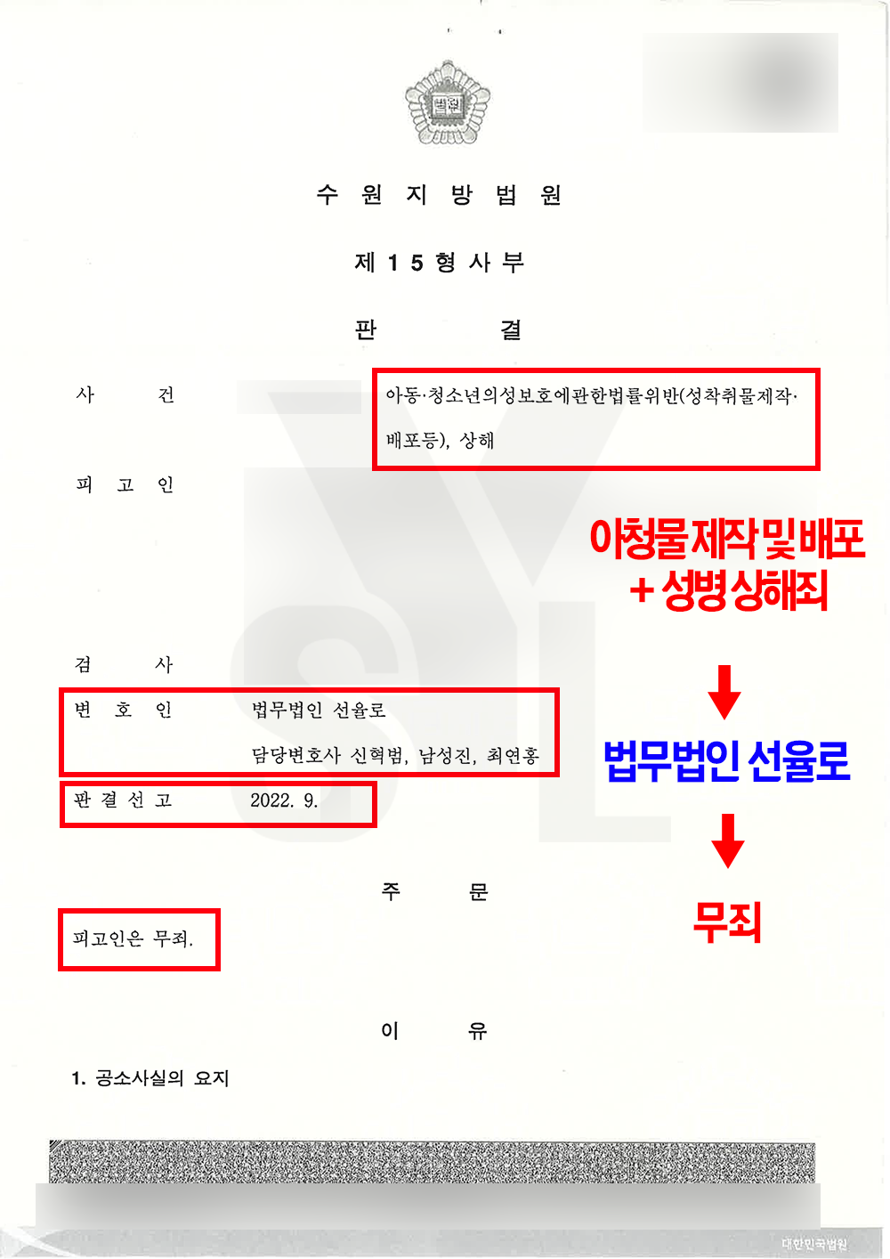 성병 상해죄와 아청물 제작 및 배포로 고소를 당한 의뢰인분은 너무나 당황스러운 마음에 다급하게 선율로 성범죄전담팀을 찾아주셨습니다. 전담팀은 사건의 쟁점을 면밀히 파악하였습니다. 우선 상해죄에 대해서는 의무기록지상 의뢰인분이 과거 관련 병으로 병원 치료를 받은 이력이 있는 것은 사실이나 피해자와 관계를 맺기 훨씬 이전에 약물치료 등을 모두 마쳐 치료가 된 것으로 알고 관계를 맺었고, 피해자에게 바이러스를 전파하고자 하는 상해의 고의가 없었다고 주장하며 시기상으로도 피해자의 상해 발생이 의뢰인과 관계 때문이라는 인과관계를 단정할 수 없다는 점을 여러 증거자료와 함께 제출하여 성립죄가 성립할 수 없음을 피력하였습니다. 아청법 위반 혐의에 관해서는 피해자의 일방적인 주장일 뿐, 피해자의 주장에는 신빙성이 떨어지고 증거가 없이 오직 추측에 의한 진술이라는 점을 강력하게 반박하였습니다.