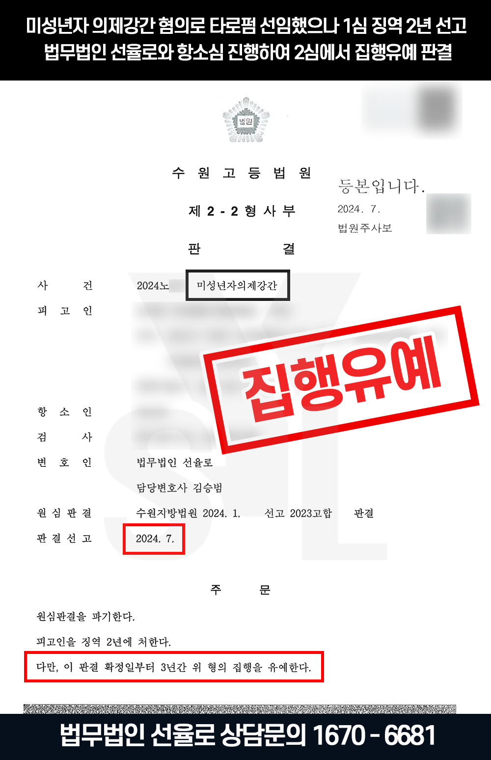 하지만 A씨는 피해자가 미성년자임을 인지하고 있었던 만큼 매우 불리한 상황이었고 결국 징역 2년을 선고받았다고 하였는데요. 1심은 타 로펌에서 진행하였으나 항소심을 통해 집행유예 이끌어내기 위해 관련 사안을 다수 다뤄본 선율로의 조력을 받은 사례입니다.