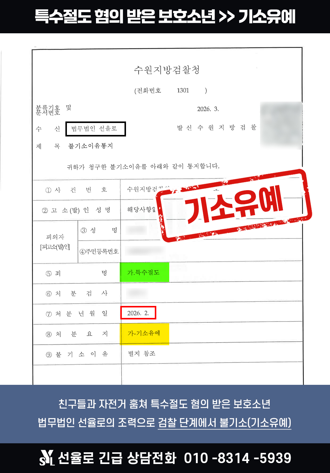 | 853 | 기소유예 | 수원특수절도변호사 | 친구들과 자전거 훔쳐 특수절도 혐의 받은 보호소년 사례 (2026.02) | 2026-03-05 | 113 |