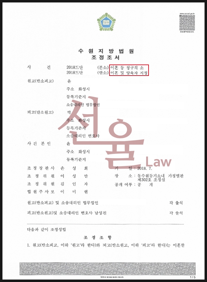 법원은 조정을 통하여 이혼을 결정하고, 의뢰인을 친권자 및 양육권자로 지정해줬고, 의뢰인이 받아들일 수 있는 범위에서 재산분할도 내려줬습니다.