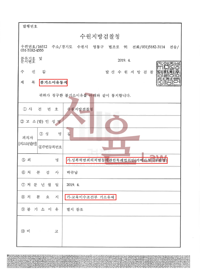 검찰은 본 변호인의 변호인의견서에 적시된 내용을 종합하여 결국 의뢰인에게 2019. 4. 25. 기소유예(불기소) 처분결정을 내렸습니다.
