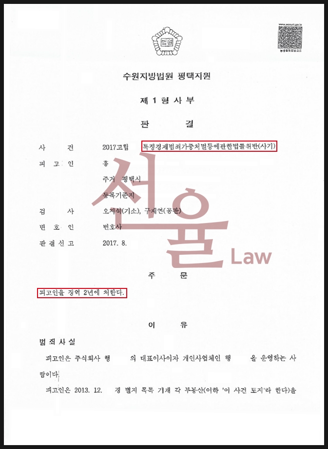 평택에 큰 농지와 산을 소유하던 의뢰인은 사업자금이 필요하여 매수인에게 부동산을 10억원에 매도하는 계약을 체결하였습니다. 그런데 매매계약 체결 후, 의뢰인은 자신이 운영하던 회사의 채권자로부터 채무 변제의 강력한 압박을 받게 되자 매매계약을 체결한 위 부동산에 가압류를 설정해 주었고, 이러한 사실을 매수인에게 고지하지 않았습니다. 그러자 매수인은 의뢰인을 특정경제범죄가중처벌등에관한법률 제3조 제1항(사기)으로 고소하여 의뢰인은 재판을 받게 되었습니다.
