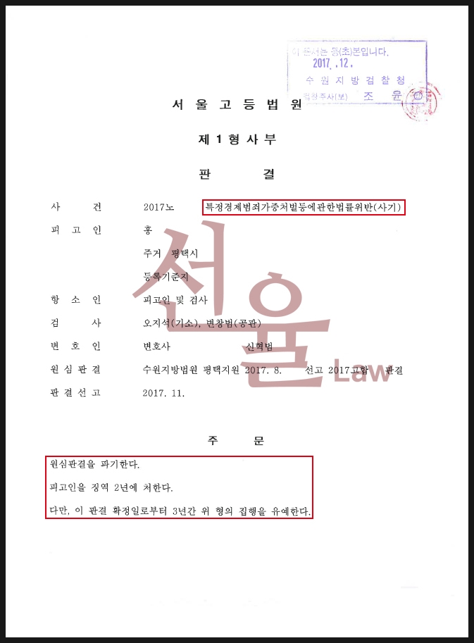 서울고등법원에서 열린 재판에서 재판장님은 수원법률사무소 수원형사변호사인 본 변호인이 제출한 변호인의견서를 보시고 본 변호인의 변소가 매우 설득력이 있다고 직접 법정에서 언급하셨습니다. 특히 미필적 고의 주장이 본 사건의 핵심임을 다시 한번 언급하셨습니다. 마침내 수원법률사무소 수원형사변호사인 본 변호인의 변소로서 항소심 법원은 1심 판결을 파기하고, 의뢰인에게 실형 2년에 집행유예 3년의 형을 선고하였습니다.