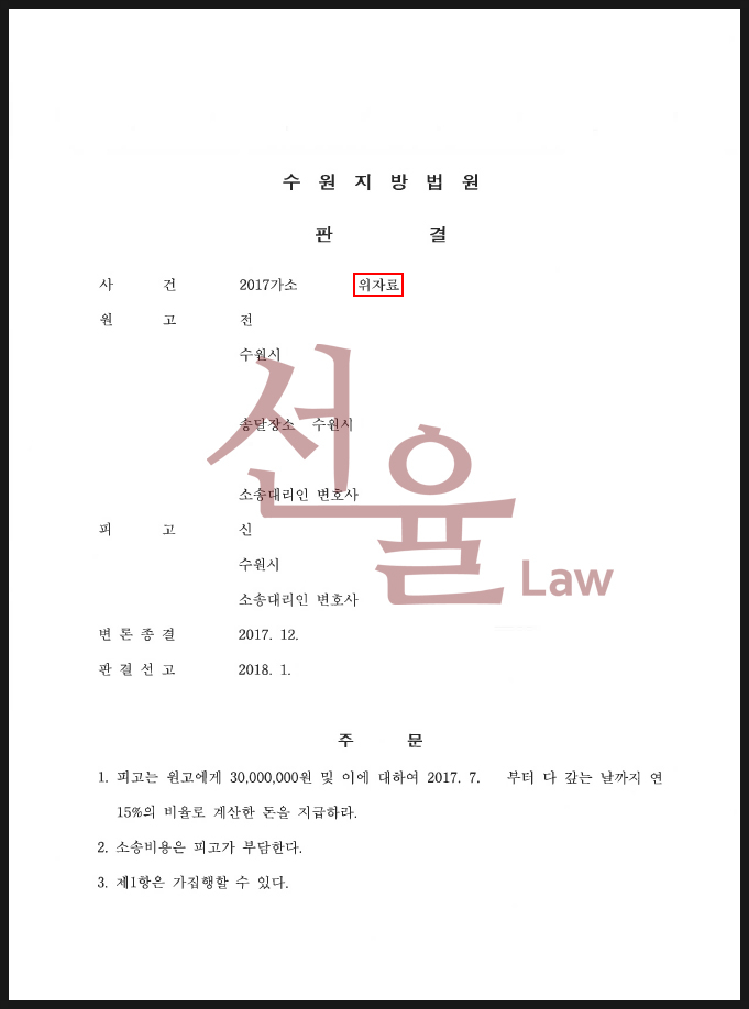 본 변호인의 조력으로 의뢰인은 3,000만 원의 위자료 청구 소송에서 전부 승소하였습니다.