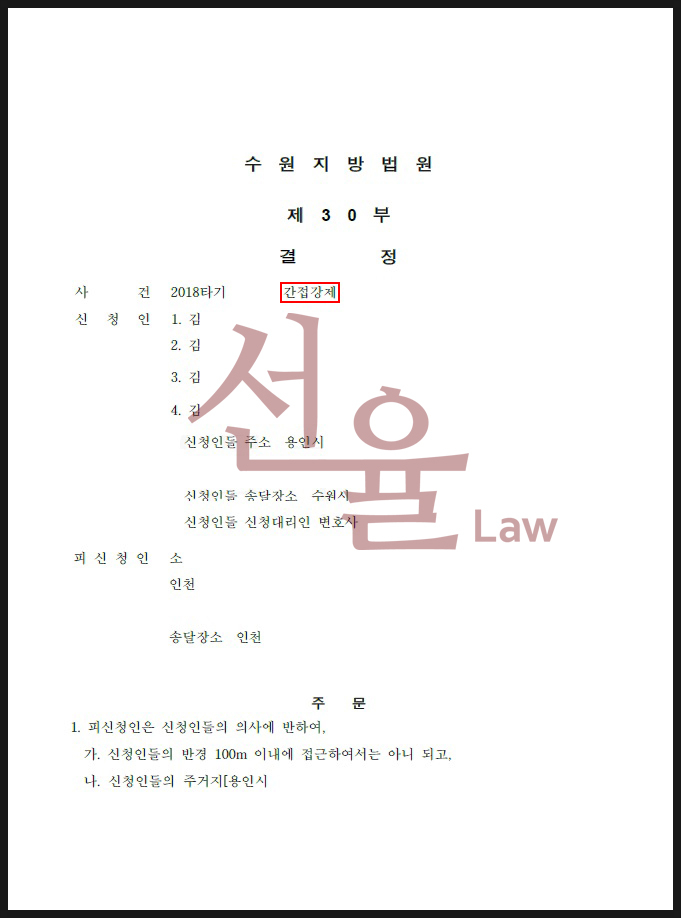 법원의 접근금지가처분 결정이 있어도 간접강제결정이 없으면 가해자의 행위를 막을 수가 없습니다. 가해자의 행위를 예방할 수 있는 근본적인 수단은 간접강제입니다. 본 사건 역시 법원의 접근금지가처분 결정 후에도 반복하여 가해행위를 하는 가해자의 가해행위를 막기 위해 부득이 간접강제를 신청하게 된 것이었습니다.