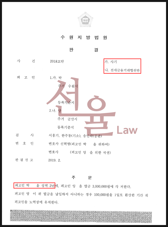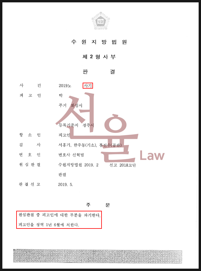 의뢰인은 지인인 투자자들로부터 투자 수익 보장 약정을 했고 변제 시기까지 정해서 투자를 받았습니다. 그리고 고소인 중 일부로부터는 직접 돈을 받지 않고 다른 투자처를 소개해주기까지 했습니다. 그런데 의뢰인이 소개했던 다른 투자처가 알고 보니 모두 허위였습니다. 의뢰인도 그 투자처에 5,000만 원을 투자했고 좋은 투자처라며 지인을 소개해주어 그 지인인 고소인은 1억 원을 투자했던 것입니다. 단순히 투자처 소개에 그쳤으면 별 탈이 없었겠지만 의뢰인 투자처를 소개해주면서 그 투자처가 잘 못 되면 자신이 전부 책임지겠다며 확약서를 작성해준 것이 빌미가 되어 의뢰인은 1심에서 실형 2년의 유죄판결을 받았던 사건입니다.